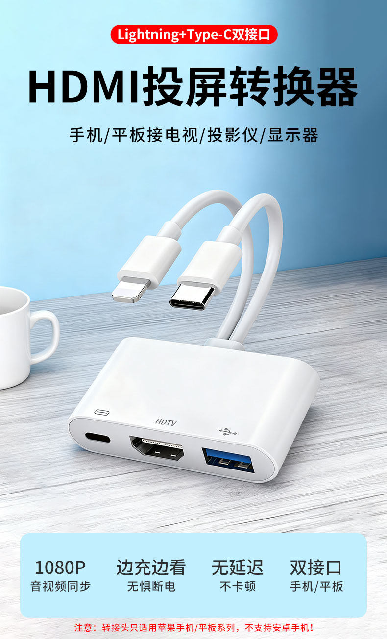 适用苹果hdmi转换头iphone17/16/15/14type-c手机lightning平板iPad转高清接口连接线投屏线转换器显示器电视