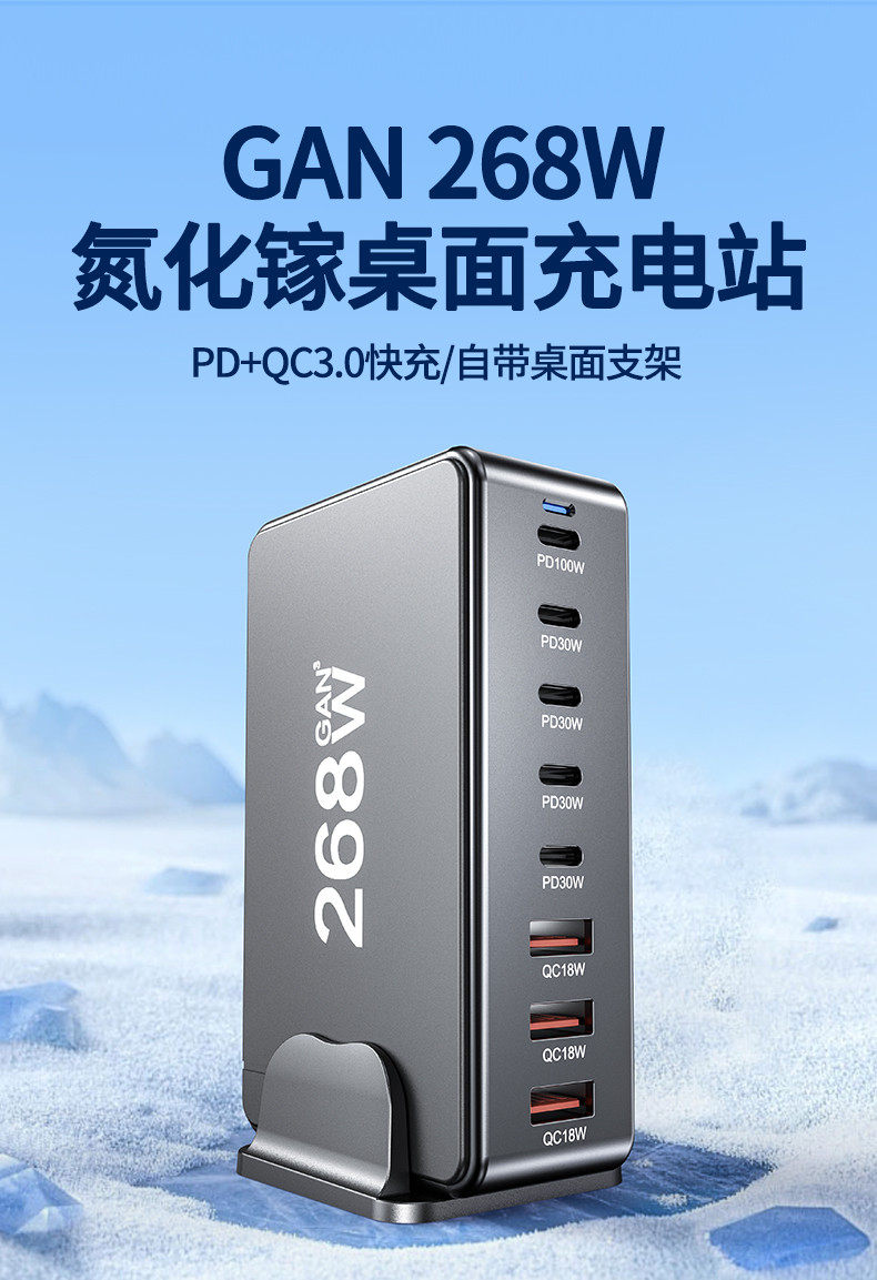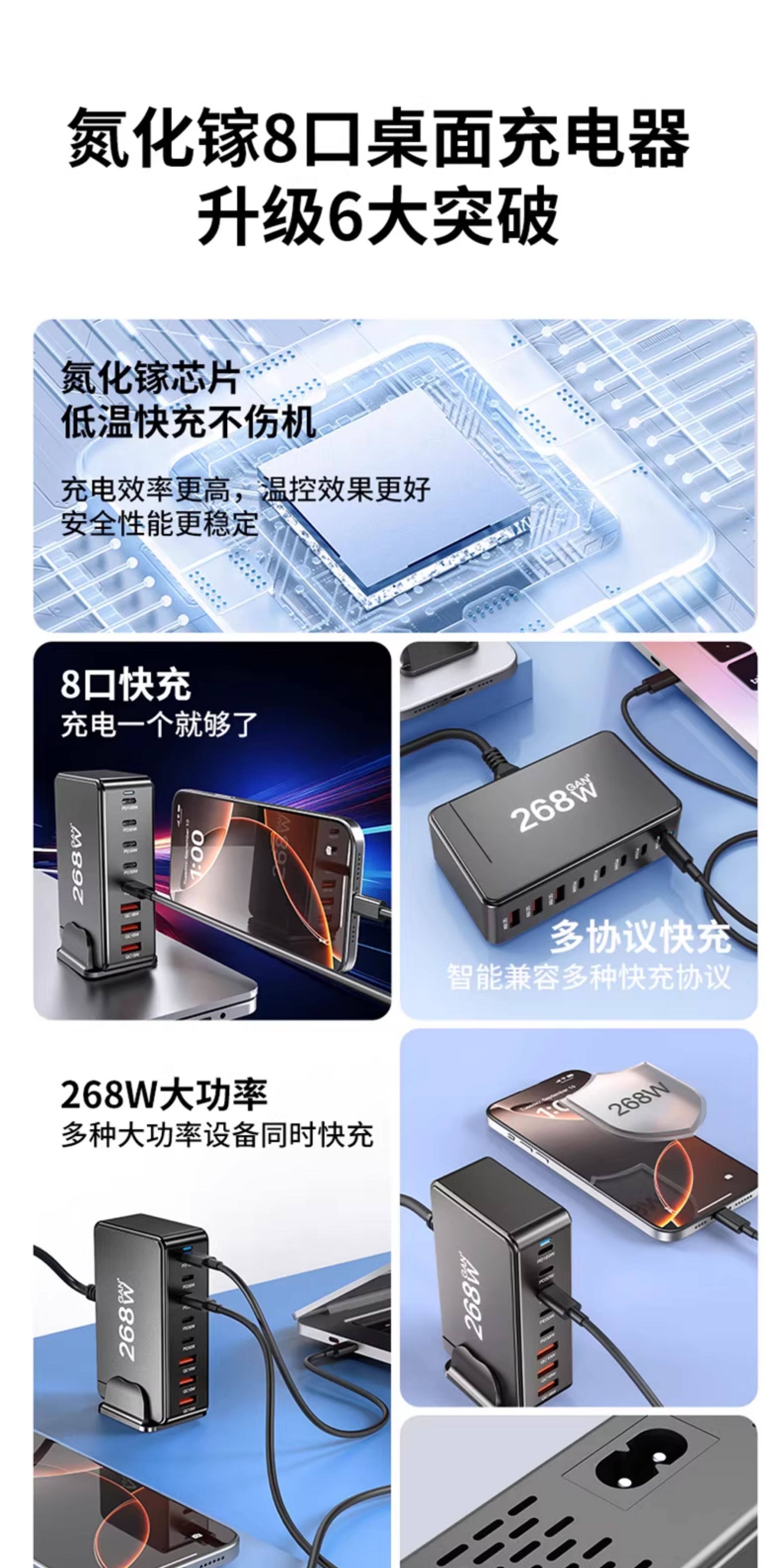 桌面充电站多口usb充电器TypeC插座多孔插头PD快充268W闪充手机笔记本通用200W多功能美英澳欧规充电坞